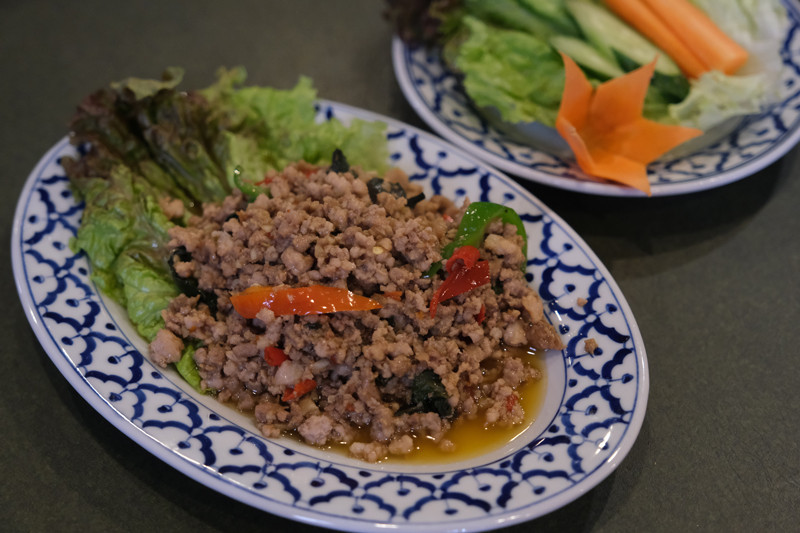 次に、こちらが「パットガプラオ」。日本では「ガパオライス」として知られていますね。これは、豚のひき肉をガプラオ(ホーリーバジル)という香りの強いハーブと一緒に炒めた料理です。唐辛子も入っていて、ピリッとした辛さがクセになります。タイではとてもポピュラーな一品で、屋台でもよく見かけます。