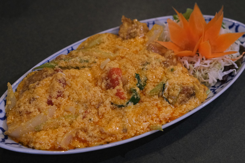 そしてこちらは、「プーパットポンガリー」といって、カレー風味のカニと卵の炒め物です。「プー」はカニを意味します。人気の料理ですね。
