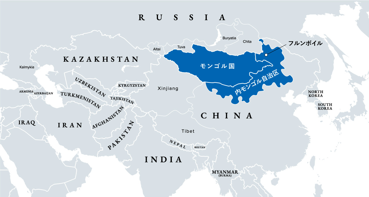 皆さんが一般的にイメージするのは、相撲などでもおなじみの独立国「モンゴル国」だと思いますが、実はモンゴル系の人々が暮らしているのはそこだけではありません。中国の北側にある内モンゴル自治区や、ロシアにもモンゴル系の人たちが暮らしています。人口では、モンゴル国は約350万人ですが、内モンゴル自治区は約2,400万人と非常に多くの方が暮らしています。もちろん、この2,400万人の多くは漢民族なのですが、モンゴル人だけで見ても約420万人います。つまり、モンゴル国よりも内モンゴル自治区に住むモンゴル人の方が多いというのが実態なんです。