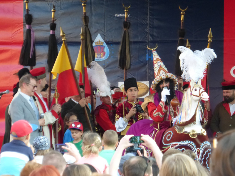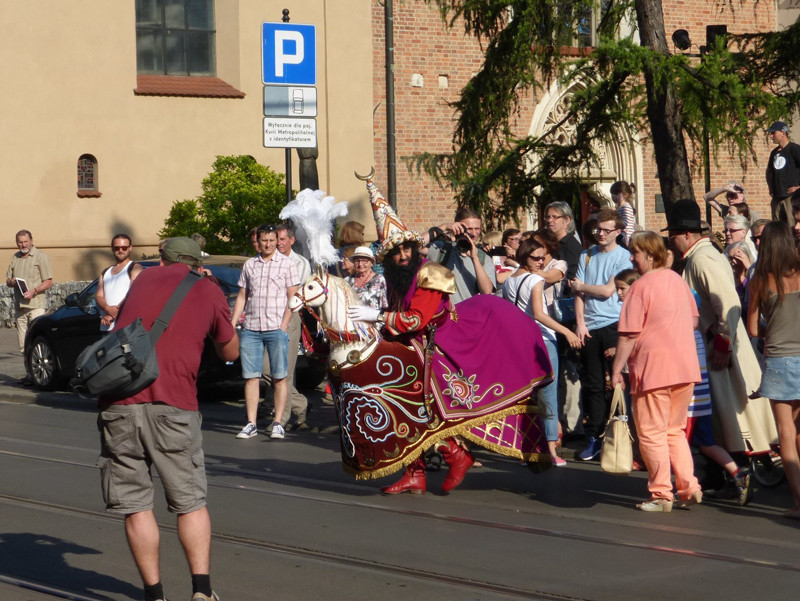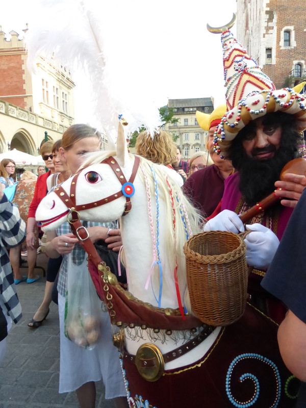 ライコニクは、クラクフの古い祭りです。その起源については諸説あるものの、13世紀のモンゴル=タタール軍の来襲にちなむと考えられています。祭りの主役は、タタールに扮した騎手「ライコニク」です。見ての通り、正確な考証に基づくものではなく、昔の民衆の素朴な想像による「タタール風」であって、馬も本物ではなくホビーホースです。ライコニクはクラクフ中心部を練り歩き、彼が手にする槌矛(メイス)で叩かれると幸運に恵まれると言われるため、見物人・通行人はこぞって彼に群がります。