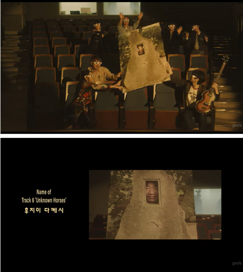 ミュージックビデオのカット。石碑の穴から覗いている男性が藤井豪准教授