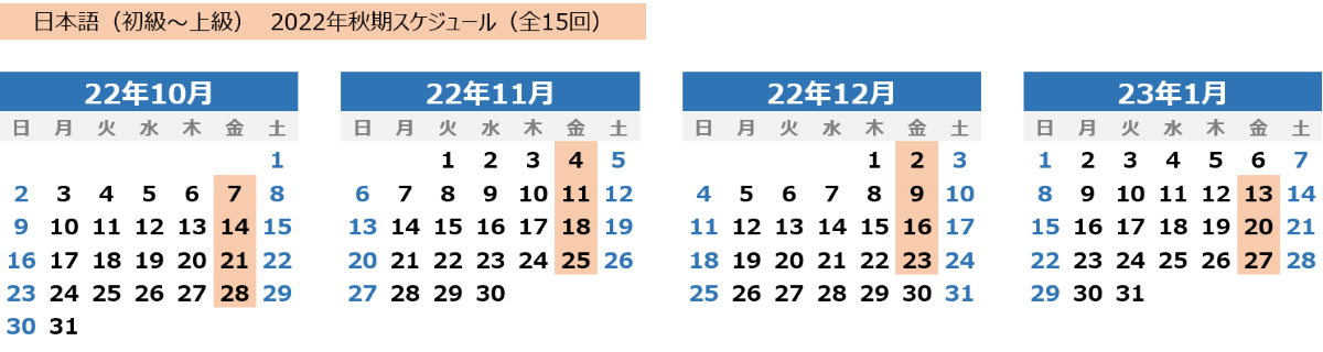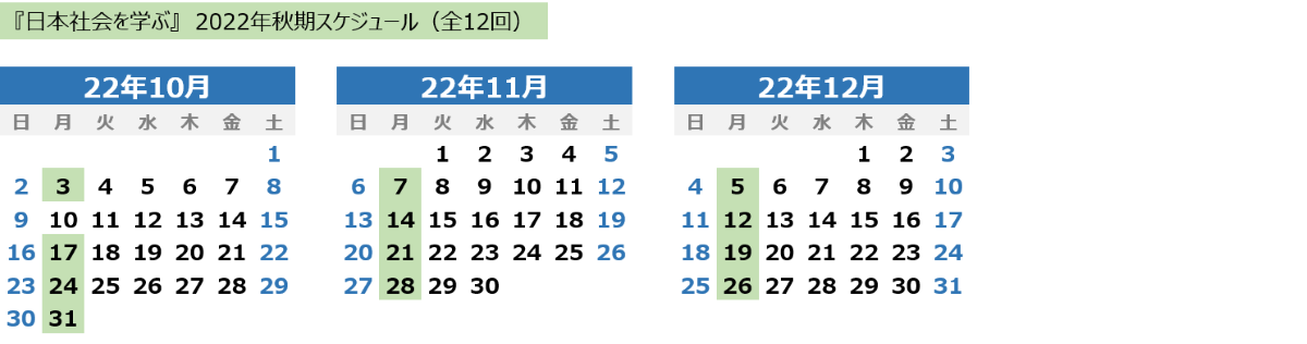 ※2022年11月3日(木)、2022年12月29日(木)、2023年1月5日(木)は休講 - 開講日・時間:木曜日 日本時間 20:00~21:30(90分)